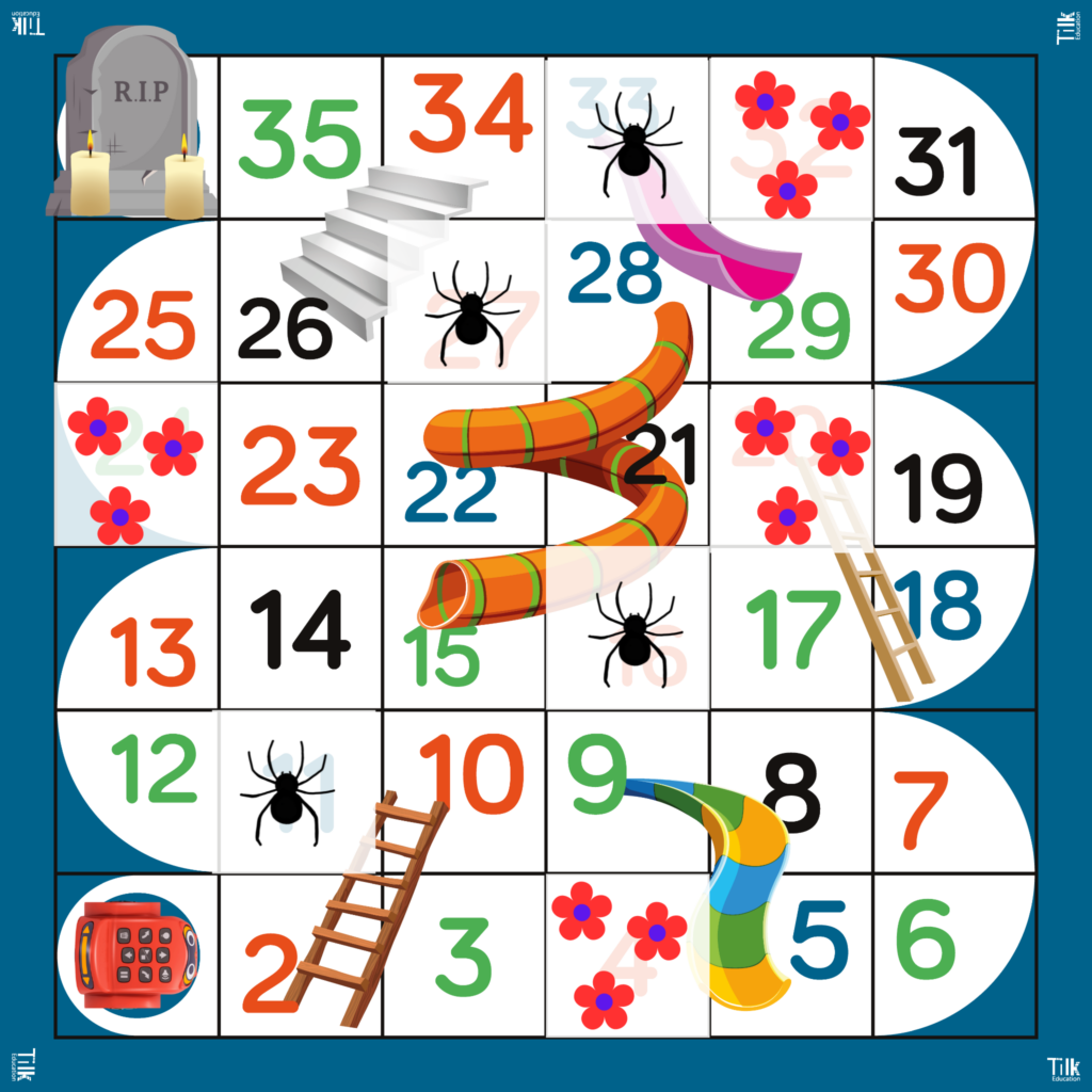 Jugaremos sobre el tapete de toboganes y escaleras siguiendo las reglas básicas de ese juego, pero añadiremos en algunas casillas flores y arañas.